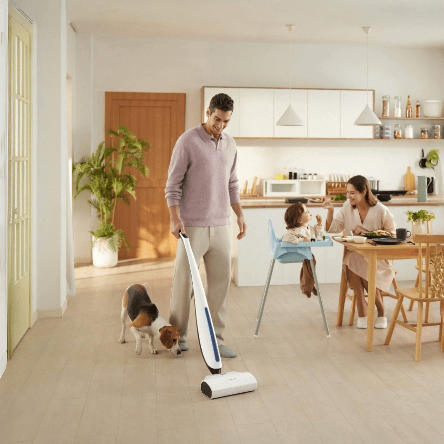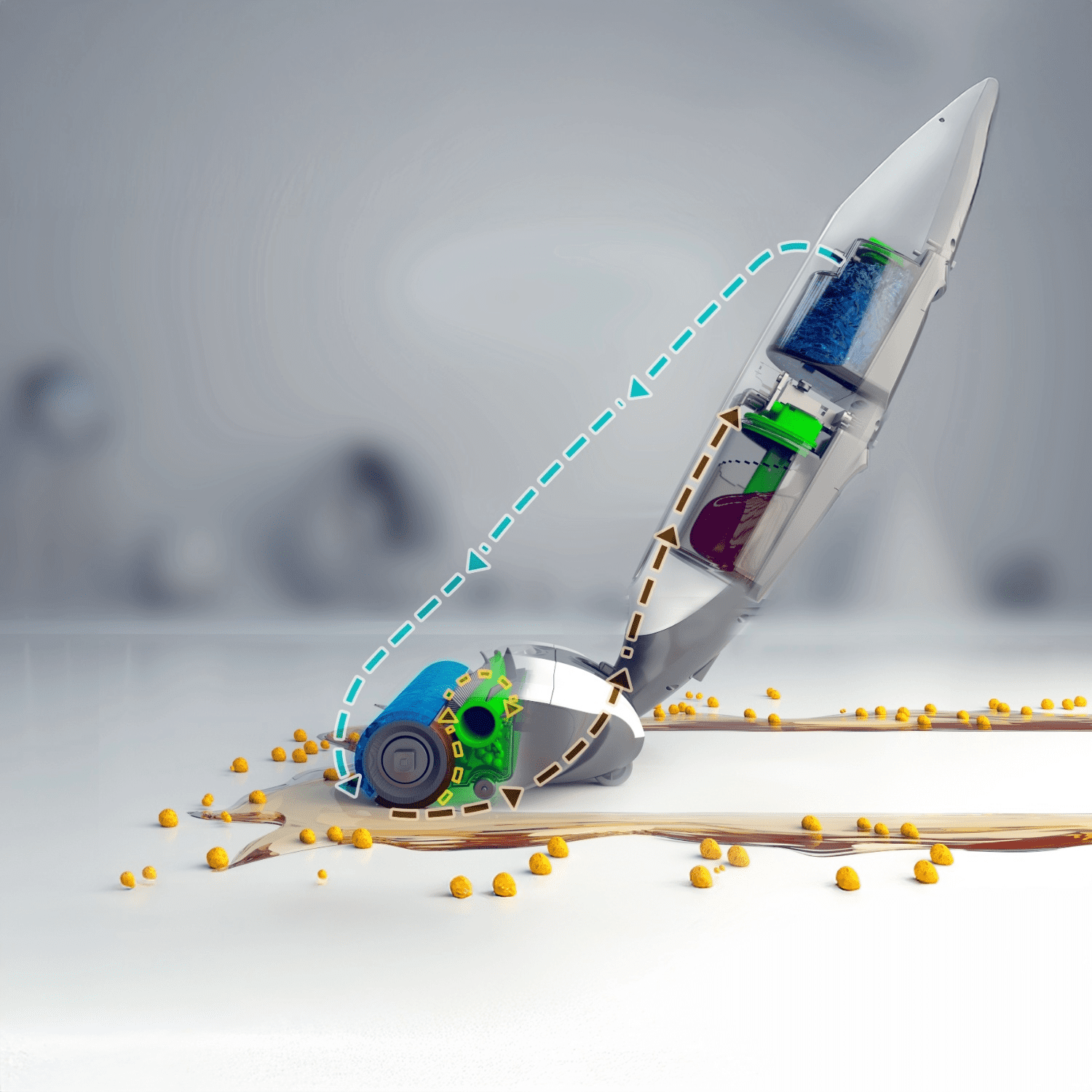 Le nettoyeur de sol F500 nettoie la saleté et ramasse efficacement tous les déchets solides, les cheveux et les poils d’animaux et absorbe les liquides.